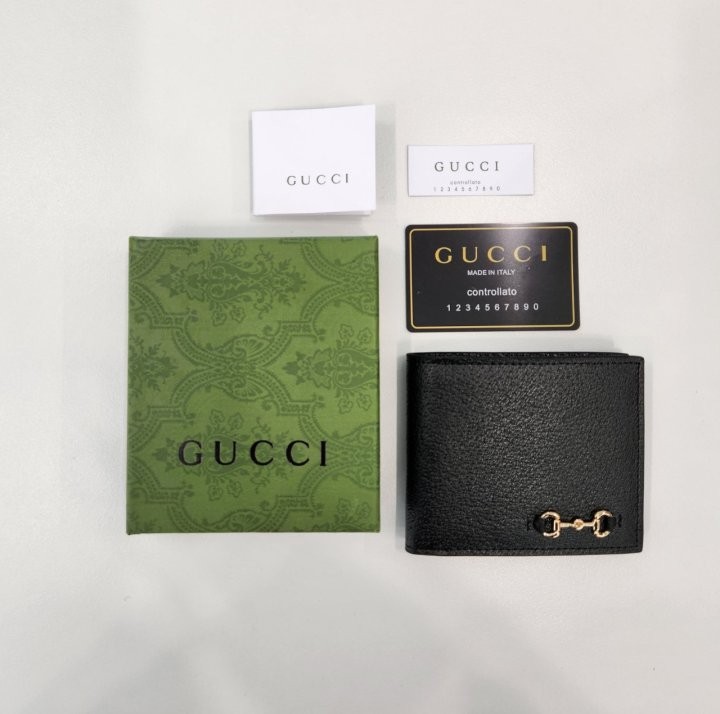 블랙 레더 골드 톤 메탈 장식 무아레 안감 홀스빗 내부: 카드 슬롯 8개, 지폐 컴파트먼트 2개 닫힘: 가로 11cm x 세로 9cm 열림: 가로 21cm x 세로 9cm