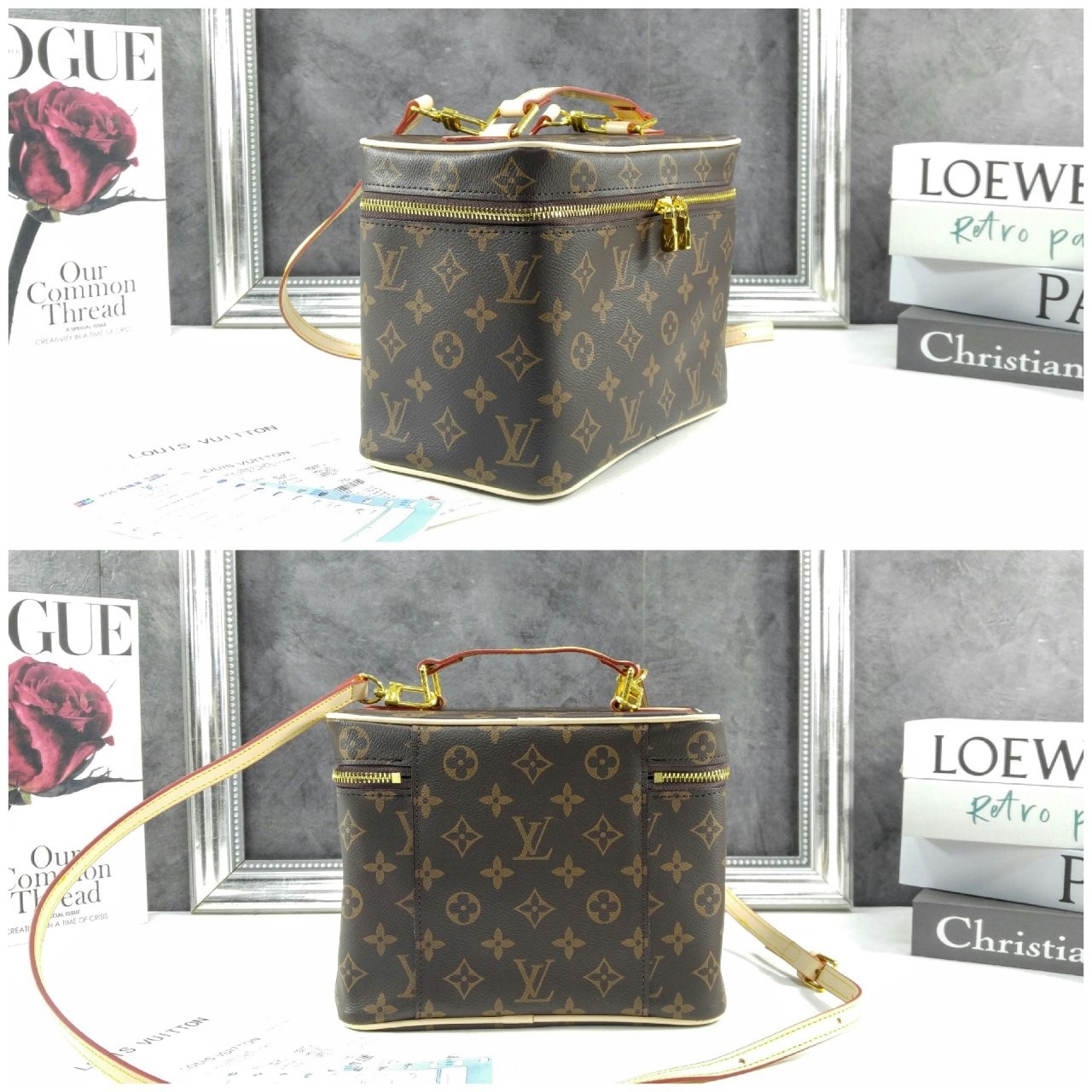 모노그램 코팅 캔버스 코팅 처리된 캔버스 소재의 세탁 가능한 안감 카우하이드 가죽 소재의 트리밍 골드 색상의 브라스 메탈릭 조각 더블 지퍼형 잠금장치 대용량 플랩 아랫부분 지퍼형 포켓 내부 플랫 포켓 1개 내부 더블 플랫 포켓 1개 핸들:심플 탈부착 스트랩