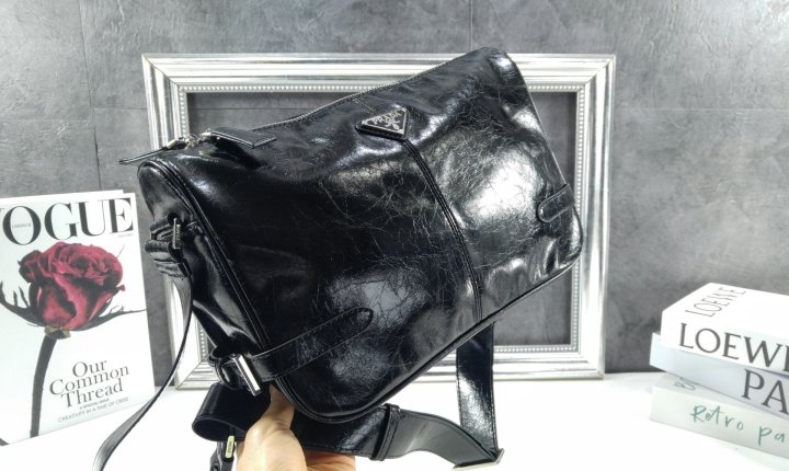 버클이 달린 측면 장식 스트랩 맞춤 조절형 가죽 숄더 스트랩 에나멜 메탈 트라이앵글 로고 지퍼 클로저 백 참용 메탈 링이 달린 숄더 스트랩 후면 지퍼 포켓 지퍼 포켓이 있는 내부 로고 프린트 리나일론 안감