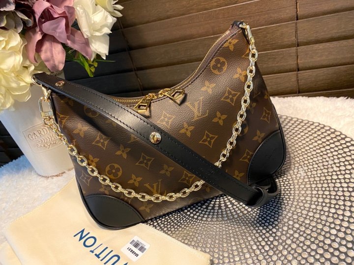 모노그램 코팅 캔버스 카우하이드 가죽 트리밍 텍스타일 안감 골드 톤 금속 디테일 가죽 모서리 4개 내부 플랫 포켓