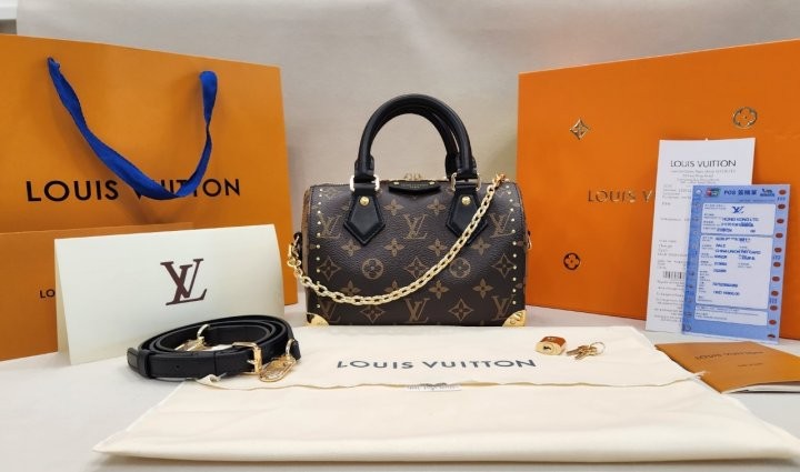모노그램 캔버스 카우하이드 가죽 소재의 트리밍 마이크로화이버 안감 골드 색상 하드웨어 패드락 1개 내부 플랫 포켓 1개