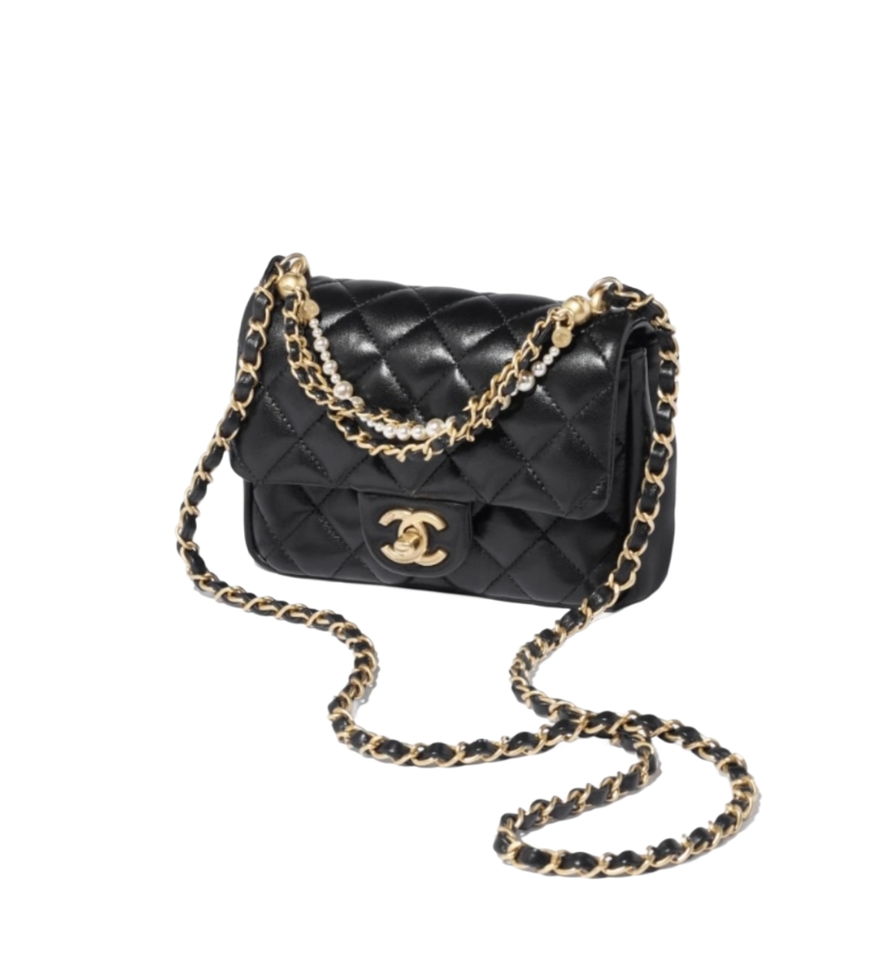쁘띠삭 진주 체인 미니 플랩 백(블랙/금장/램스킨)
